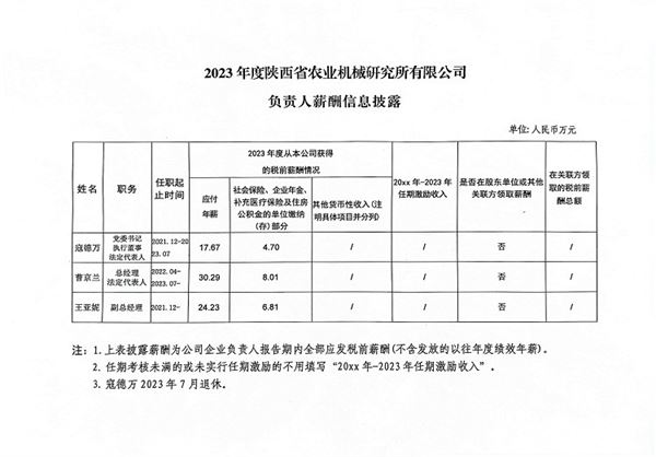 2023年度陜西省農(nóng)業(yè)機(jī)械研究所有限公司負(fù)責(zé)人薪酬信息披露