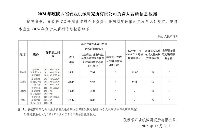 2024年度陜西省農(nóng)業(yè)機(jī)械研究所有限公司負(fù)責(zé)人薪酬信息披露
